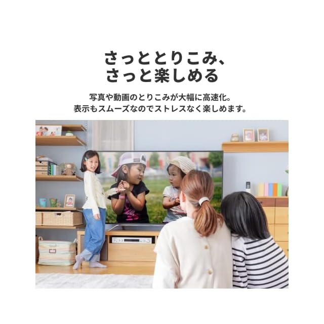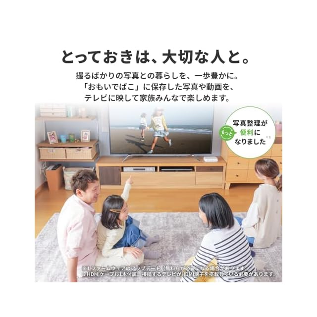 【家族みんなで楽しめる】付属のHDMIケーブルでテレビにつなぐだけ。スマホやカメラにしまったままの写真や動画を「おもいでばこ」に集めて、大切な人と一緒に楽しめる。