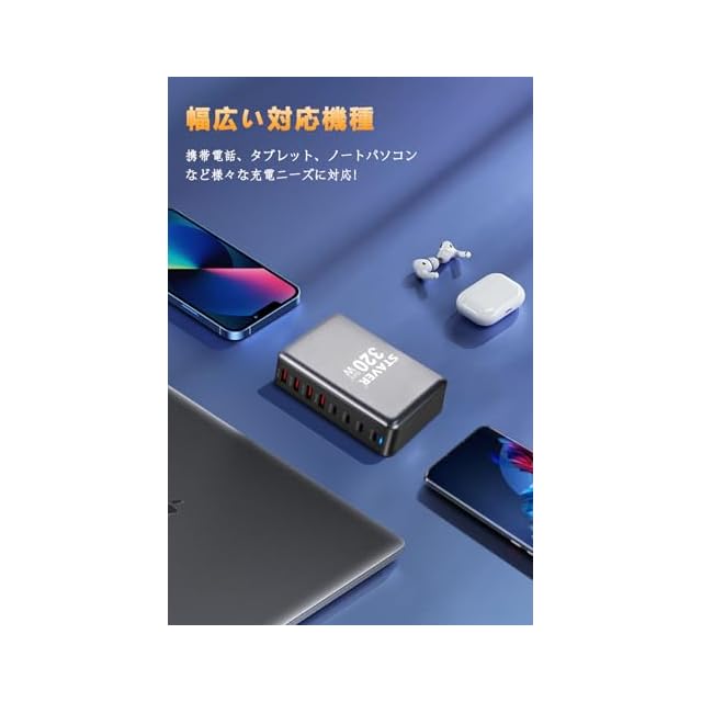 【8ポートで8台のデバイスを同時に急速充電】この充電器はUSB-Cポート×6、USB-Aポート×2の構成で、合計500Wのハイパワー出力を実現しています。8台のデバイスを同時に充電して、真の「同時急速充電」を提供します。具体的な出力配分は、USB-C1(PD3.0 100W)、USB-C2(PD3.0 100W)、USB-C3(PD3.0 65W)、USB-C4(PD3.0 65W)、USB-C5(PD3.0 65W)、USB-C6(PD3.0 65W)、USB-A1(QC 20W)、USB-A2(QC 20W)です。これにより、iPhone/Androidのスマートフォン、タブレット、Switch/Steam Deckなどのゲーム機、MacBook Proなどの高電力を必要とするノートパソコンなど、あらゆるデバイスを「同時急速充電」でサポートできます。