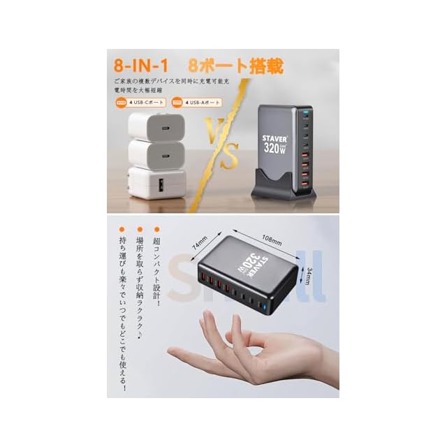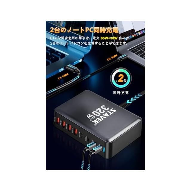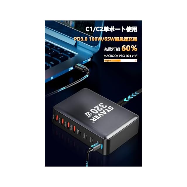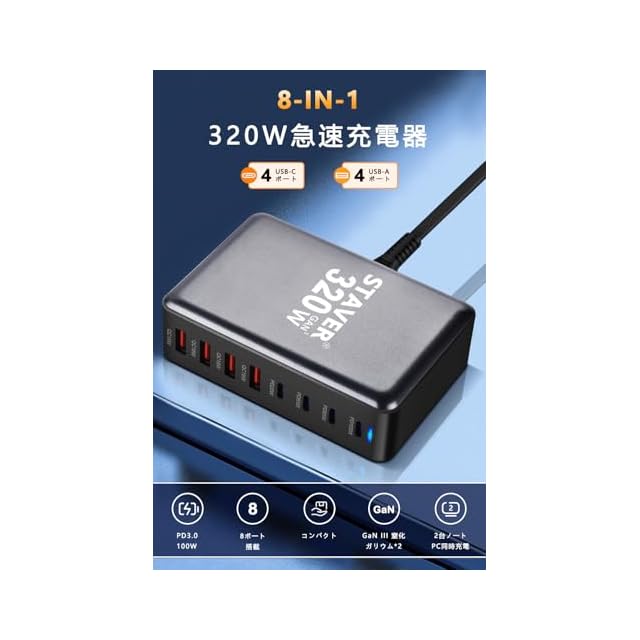 商品名:320W 充電器 【 GaNFastⅢ 8ポート 単口max 100W 1.5m電源ケーブル】 PD3.0対応【PSE技術基準適合】100W常時対応 8ポート1*100W&2*65W&4*QC18W 4 USB-C&4 USB-A 縦式省スペース ダブル 複数ノートPCに急速充電対応 MacBook Pro PD対応 iPad/iPhone/Android/その他 (ブラック-320W)