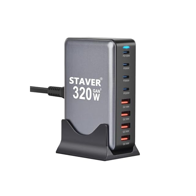 320W 充電器 【 GaNFastⅢ 8ポート 単口max 100W 1.5m電源ケーブル】 PD3.0対応【PSE技術基準適合】100W常時対応 8ポート1*100W&2*65W&4*QC18W 4 USB-C&4 USB-A 縦式省スペース ダブル 複数ノートPCに急速充電対応 MacBook Pro PD対応 iPad/iPhone/Android/その他 (ブラック-320W)