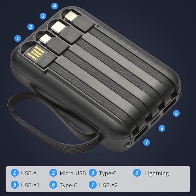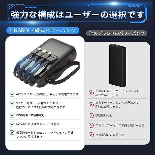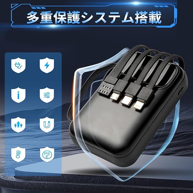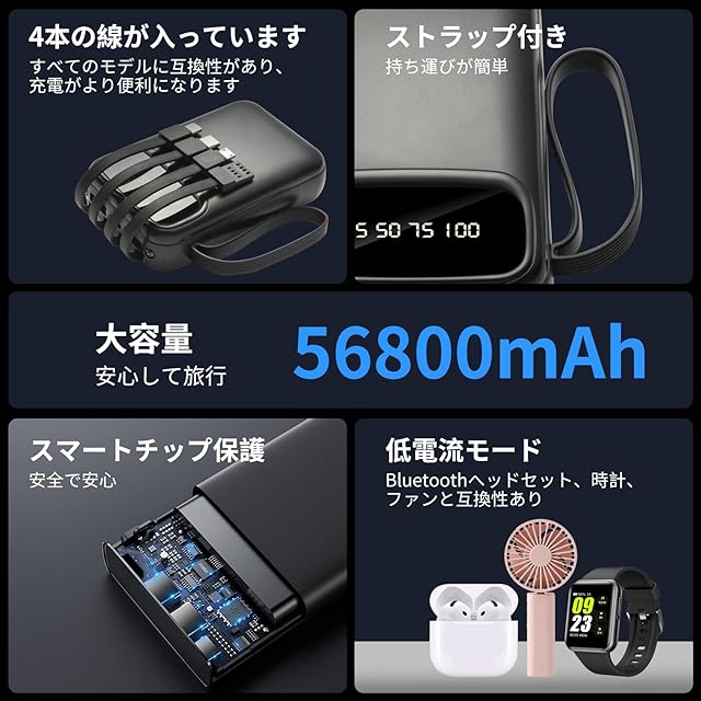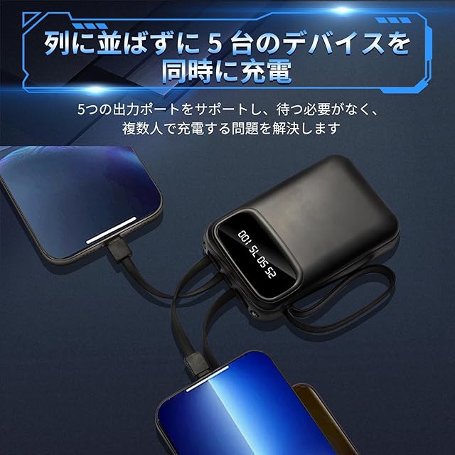 大容量56800mAhモバイルバッテリー:5台同時充電可能!安全・安心設計! このモバイルバッテリーは5つの独立出力ポート(USB-A、Type-C、Lightning、Micro-USBなど)を搭載し、スマートフォン、タブレット、イヤホン、スマートウォッチなど最大5台のデバイスを同時に高速充電可能!家族旅行やオフィスでの複数人利用にも最適です。内蔵4本の互換性抜群充電ケーブルで、あらゆるデバイスに対応し、シーンを選ばず便利に使えます。 スマート多重保護機能&PSE認証で安心! 日本の電気用品安全法(PSE)認証を取得。過充電・過電流・過電圧・短絡・過熱・過放電保護など7段階の安全システムを搭載。内蔵温度センサーとスマートチップが充電を常に監視し、安全性を確保します。低電流モードで小型デバイス(Bluetoothイヤホン、スマートウォッチなど)のバッテリー寿命を保護。 コンパクト設計&ストラップ付きで持ち運び楽々! 大容量56800mAhで長旅やアウトドアにも対応。耐摩耗性ストラップ付きで軽量かつ携帯性抜群。出張、キャンプ、日常使いまで、いつでもどこでも電力サポート!