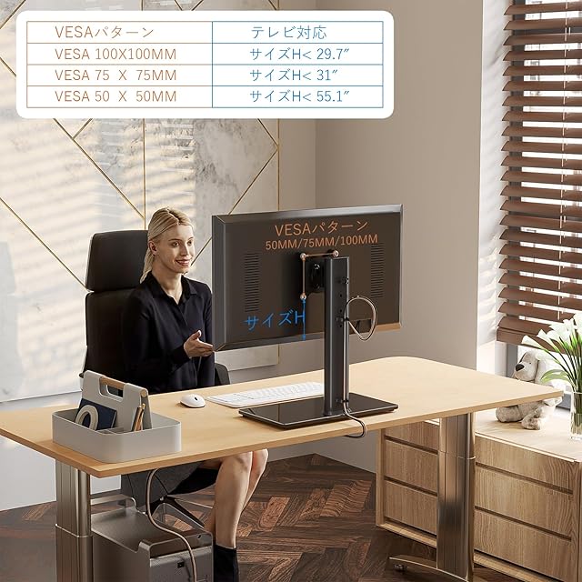 互換性☞シングルコンピューターモニターマウント、13、15、17、19、21、23、27、30、32インチLCD LEDプラズマフラットスクリーンテレビ用50×50mm、75×75mm、または100×100mmの背面取り付け穴付きライザー取り付けスクリーン、ケーブル付き コードを清潔に整理するための管理