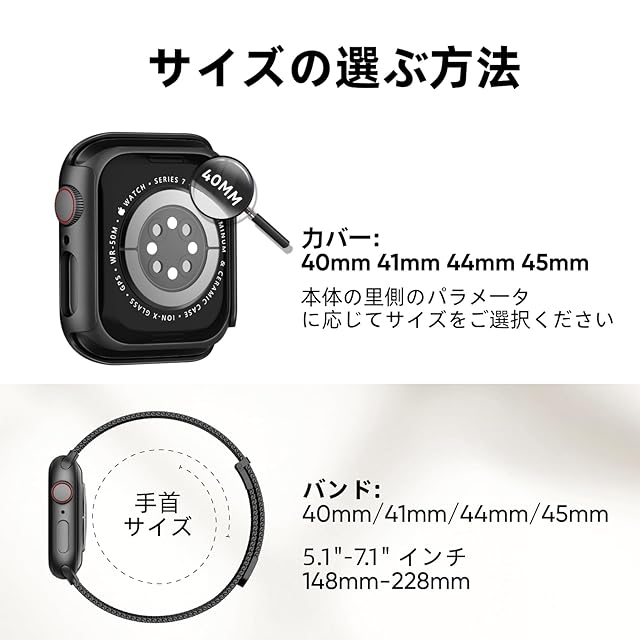 【対応機種】アップルウォッチ ケース付きバンド、Series 10 9 8 7 6 5 4 3 2 1 SEの40mm 41mm 42mm 44mm 45mm 46mm 機種だけに対応します、手首サイズは148-228mmの方に適します、に適しています男女兼用のビジネススタイル Apple Watch バンド 、iWatch本体の里側のパラメータに応じてサイズをご選択ください。