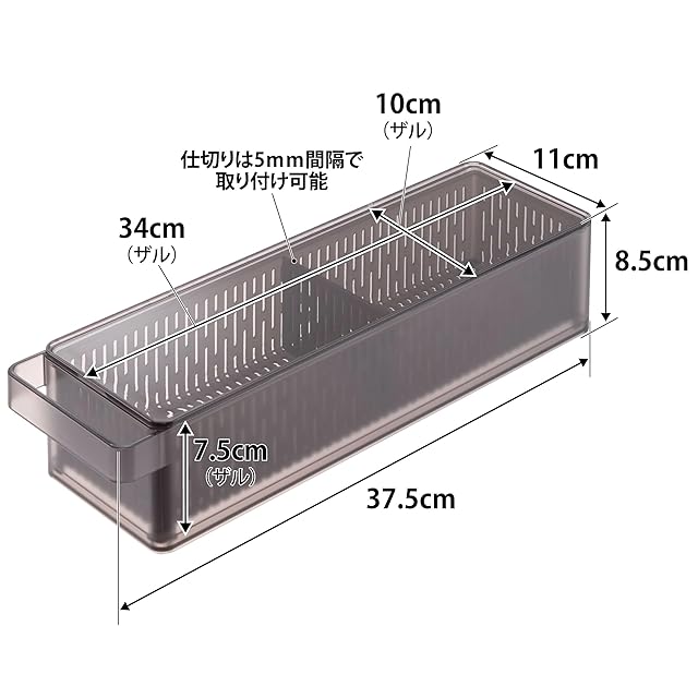 商品サイズ 容器:W37.5×D11×H8.5cm ザル:W34×D10×H7.5cm ▪商品重量:600g ▪内寸 容器:開口部W34.5×D10.5×H7.5cm ザル:開口部W33.2×D9.5×H6.7cm(仕切りは5mm間隔で取り付け可能)