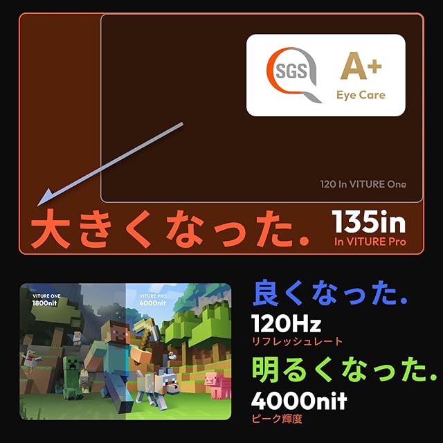 【VITURE史上、最大かつ最高輝度のディスプレイ】高精細な135インチ相当の大画面と、4000ニット(体感輝度1000ニット)の高輝度、滑らかな120Hz駆動のフルHD UltraClarityディスプレイを搭載。従来モデルと比べて画面サイズが10%大きく、輝度は120%アップ、リフレッシュレートは2倍になり、より没入感ある映像体験をお届け。
