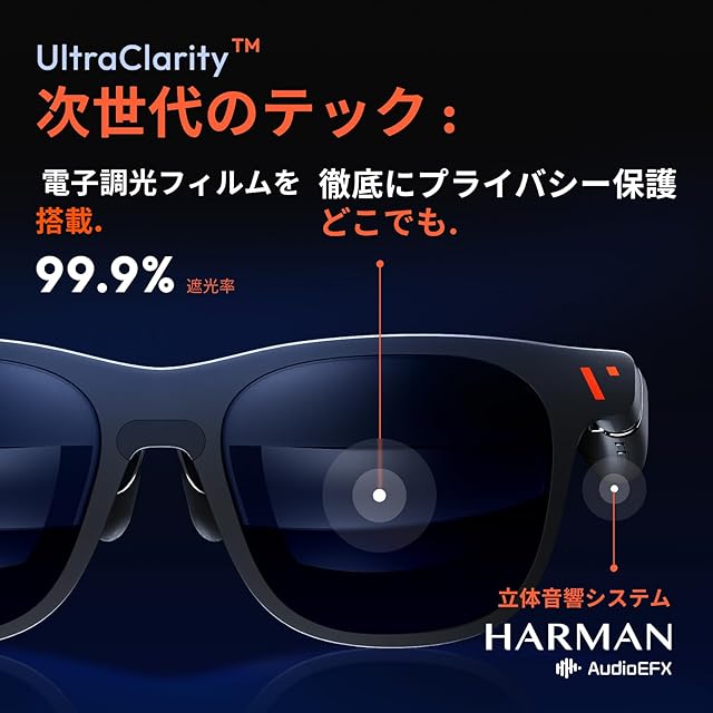【完全プライバシー保護による視聴体験】- HARMANとの共同開発による空間オーディオシステムで音漏れを防ぎながら、独自開発のUltraFreedom技術でグラス表面の映り込み(のぞき見)も防ぐ完全プライバシー保護設計。周囲の目を気にすることなく、電車や飛行機内でも安心してお使いいただけます。