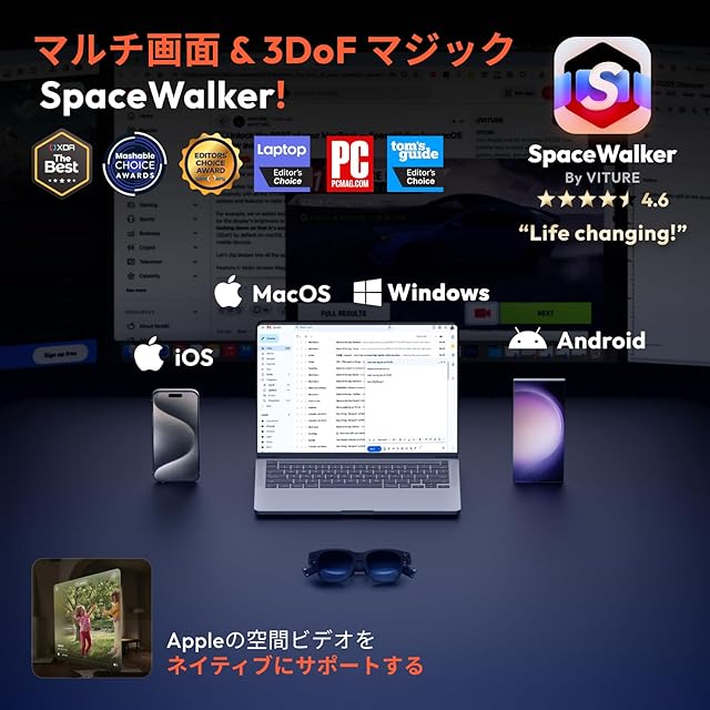 【究極の体験 = 最高のハードウェア + 最強のソフトウェア】高く評価されている当社のSpaceWalkerは、iPhone、Android、macOSで利用可能になり、Windowsサポートも近日提供されます。 ハードウェアはソフトウェアなしでは何もないため、最初から両方に焦点を当てています。 iPhoneで最初で唯一のXR体験として、このXRメガネは、わずかなコストで完全なXR体験(マルチスクリーン/3DoF/VRビデオ/1-Click 3D)を提供します。 このマルチスクリーンマジックは、AndroidとMacBookにも搭載されています。