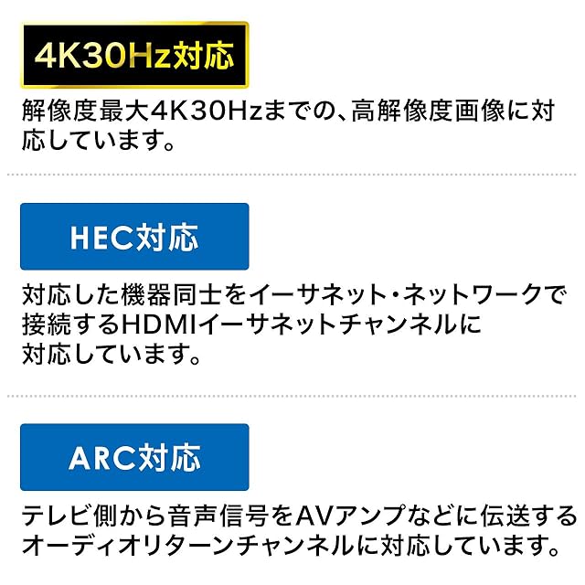 HDMIを搭載したDVD、ハードディスク、ブルーレイディスクレコーダー、パソコン本体などとハイビジョンテレビ、液晶ディスプレイ、プロジェクターなどの機器と接続できます。解像度は最大4K30Hzまでの、高解像度画像に対応しています。