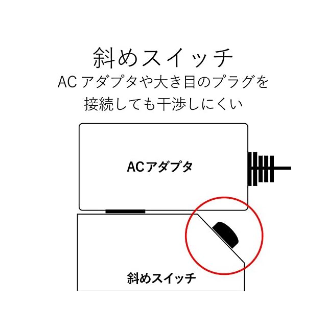 個別スイッチには、ACアダプターや大きめのプラグを接続してもスイッチに干渉しにくい、斜め配置のスイッチを採用しています。