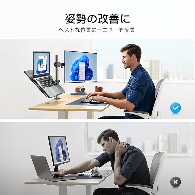 【2in1モニターアーム】PCモニターアームとノートパソコンスタンドが融合されていて、ディスプレイやノートパソコンがより快適に使えます。PCモニターとノートパソコンという組み合わせになってますが、2枚PCモニターをつけることも可能です。PC&ノートパソコンのデュアル環境の方にお勧めです。