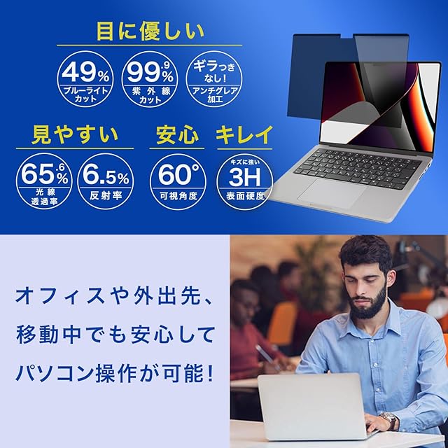 ✅ 【ブルーライトカット&反射軽減】プライバシーフィルターはブルーライトカットとUVプロテクションの機能を備えています。 ご利用になる方のプライバシーを保護するだけでなく、紫外線は99%、ブルーライトカットは49%カットするので、大切な目を守ることができます。 アスクリーンコーティングによって透過率は65%を維持しつつ、スクリーンを傷や汚れからしっかり保護します。