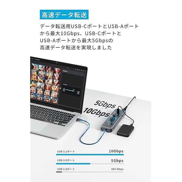 マルチタスクに最適:USB PD対応ポートを使用して最大100Wの出力でノートPCを充電しながら、USB-CポートとUSB-Aポートからそれぞれ最大10Gbpsでの高速データ転送も可能で、マルチタスクをこれ一台で実現できます。 (※付属のアダプタはノートPCへの充電は非対応です。ノートPCへ充電をする際は付属の電源アダプタに加え、別売りの充電器とUSB-C & USB-Cケーブルからの給電が必要になります)