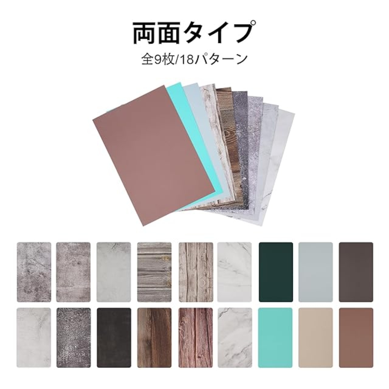【様々なニーズを合わせる】9枚両面背景紙は18種類の図案があり、お菓子やアクセサリー、ジュエリー、その他の小さい製品を撮影しても、色々な撮影シーンを作ることができます。図案が美しく、色が鮮やかで、お客様の作品をさらに彩っています。