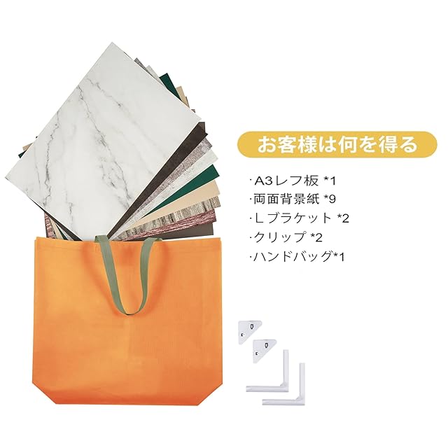 撮影背景セットは、お客様の撮影に無限のアイデアと便利さを加えます。両面撮影用背景紙x9枚、レフ板x1、クリップx2、L字クリップx2、ハンドバッグ一つが含まれており、さまざまな撮影ニーズに対応しています。