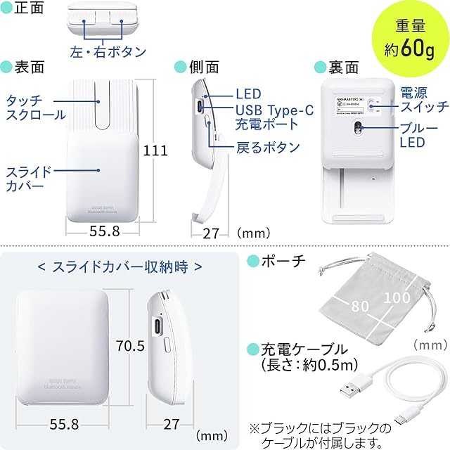 商品名:サンワダイレクト 小型マウス Bluetooth 静音 戻るボタン搭載 Mac/iPad/iPhone/Android対応 充電式 ブルーLED 持ち運び ポーチ付き ブラック 400-MABT192BK