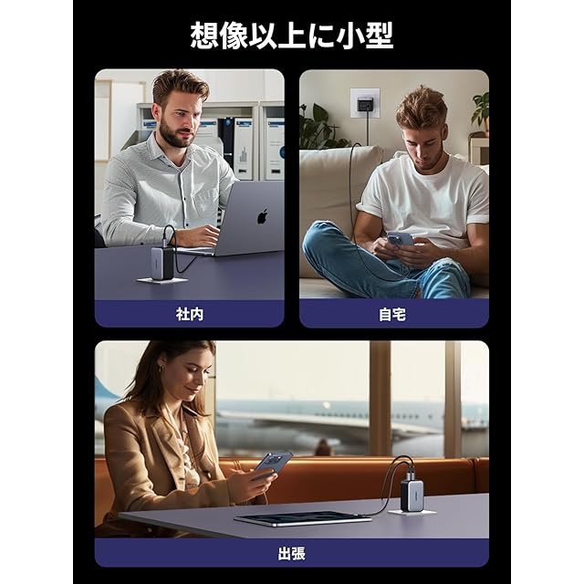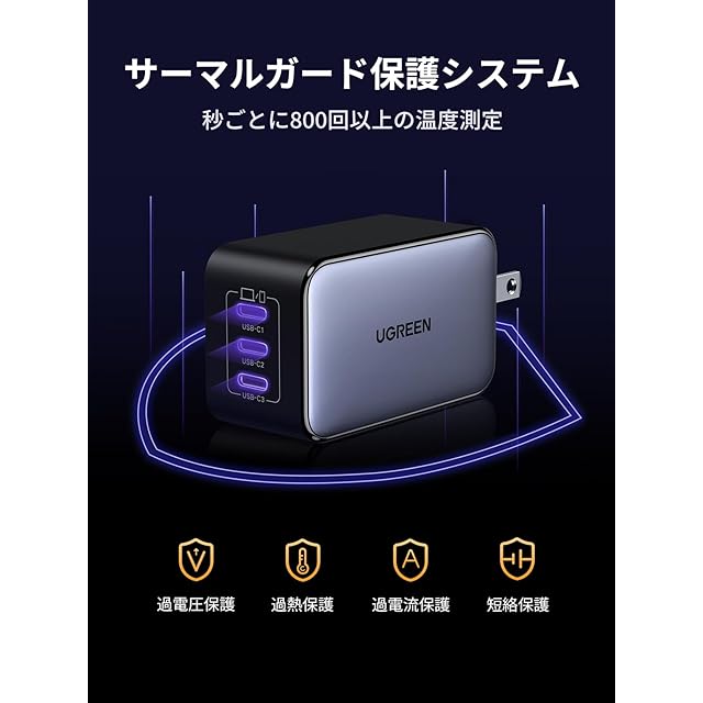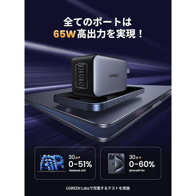 【すべての充電ポートが65Wの高速充電に対応】他の高出力充電器と比較して、UGREENのCシリーズ充電器は、いずれ一つのポートが65Wの急速充電を実現するため、誤ったポートに差し込んだことによる充電速度の低下を心配する必要はありません。そして、最先端のスマート認識技術を搭載しており、デバイスが必要とする充電電力を自動的に検出し配分し、過剰な電力でデバイスを破損させる心配はなく、充電器の寿命も長持ちする .