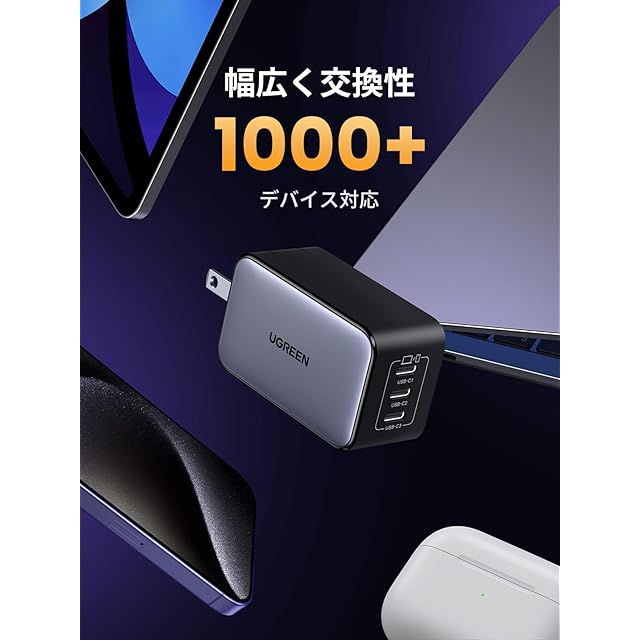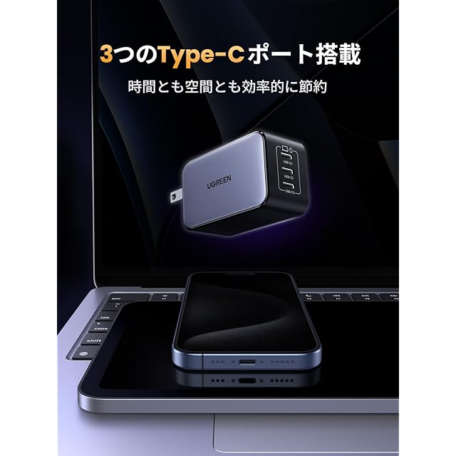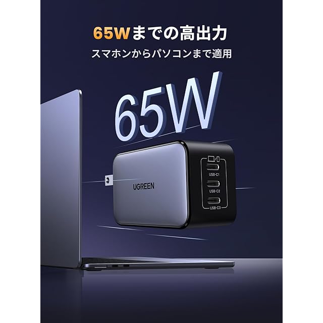【3つタイプCポート付き】UGREENのタイプC充電器はType-Cポートを3つ搭載して、3台のデバイスを同時充電に対応。65Wの出力パワーはパソコンから携帯までの全てのUSB-Cデバイスに充電可能で旅行でも自家用でもこの一つで十分(単ポートも65W対応) .