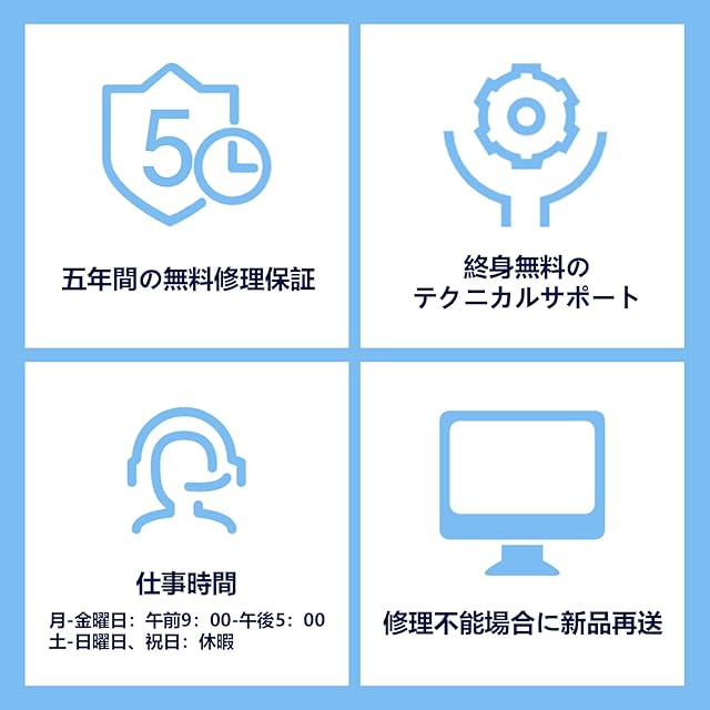 5、[サポート]5年間の無料修理・ご購入から1か月以内であれば、問題が発生した場合は無償で交換いたします。終身の技術サポートを提供する。無輝点1年・画面上に無輝点が見つかった、製品に関する問題と不明点がございましたら、お気軽にお問い合わせください。
