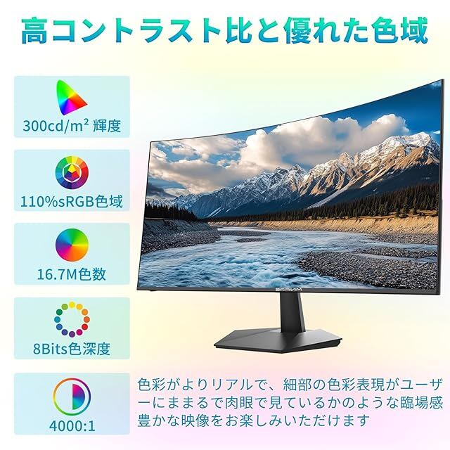 1、[画面サイズ] 27インチ VA モニター 、[最大解像度] FHD 1920×1080、[アスペクト比] 16:9、[コントラスト比] 4000:1、[輝度] 300cd/㎡ 、[色域]sRGB 110% 、[色深度] 16.7万色、8Bits、[曲率] 1500R、HDR対応。