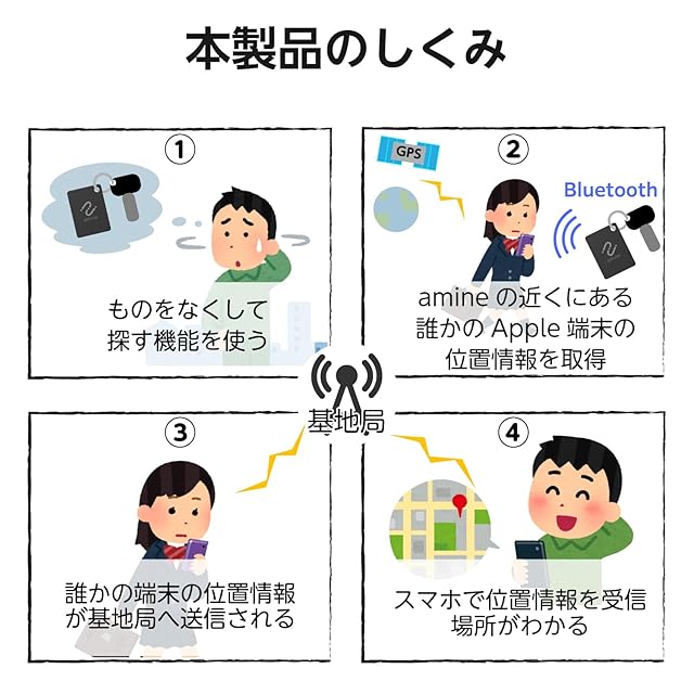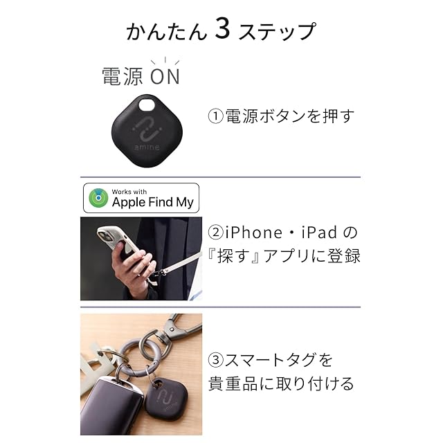 使い方はかんたん3ステップ。「電源ボタンを押す」「iPhone・iPadの『探す』アプリに登録」「大切な荷物に取り付ける」だけで完了です。位置情報はアプリからいつでも調べることができます。