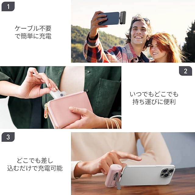 【ケーブル不要で持ち運び楽々】モバイルバッテリーは超コンパクトサイズなので、ポケットや財布にも簡単に収納でき、持ち運びも楽々です。ケーブルを使わずに直接差し込むことで、充電しながらスマホを使用できるのでとても便利です。