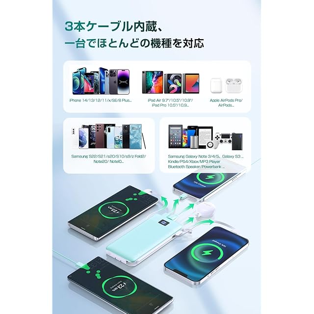 【3種類のケーブル内蔵・5台も同時充電】多機能 モバイルバッテリーのはmicroUSB、iPhone用とtype-Cなど3規格出力ケーブルが内蔵されます。様々なケーブルを持ち歩く必要がなく、各タイプのデバイスにも対応出来ます。更に、Type-C出力/入力ポート、USB-A出力ポート搭載して、合わせて最大5台の機器を同時に充電することができる携帯充電器です。手軽にスマホを充電できる為に、内蔵ケーブルがストラップに変身でき、片手で充電しながらスマホも使用可能、持ち運び超便利です。