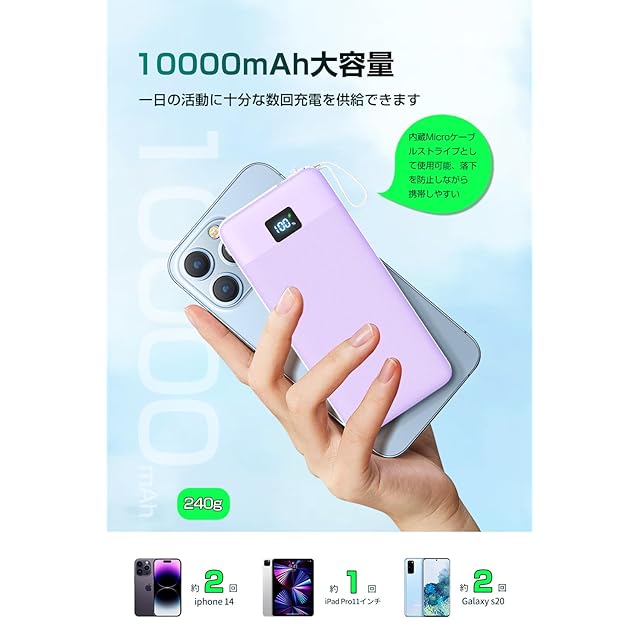 商品名:【OMKUY 新登場】モバイルバッテリー 大容量 コンセント 10000mAh 薄型(折り畳みコンセント一体式/パススルー/PD 20W&SCP22.5W急速充電/3本ケーブル内蔵)携帯充電器 持ち運び便利 コンパクト モバイルばってりー PD3.0 携帯バッテリー 軽量 スマホ AC パワーバンク PSE認証 iPhone&Android等対応 (Purple)