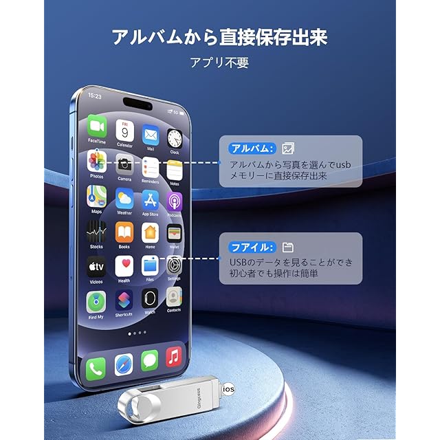 【完全アプリ不要】Phone/スマホから直接usbに写真を移す:Phoneのアルバムを開く→保存したい写真を選択→「USBへ転送」をタップするだけ!3ステップで直保存可能な完全アプリフリー設計。ios端子を挿すだけで自動認識され、フォルダ分けも自動化(年/月別分類)。機械操作が苦手なシニア層でも迷わず使えるカラー図解マニュアル付き。