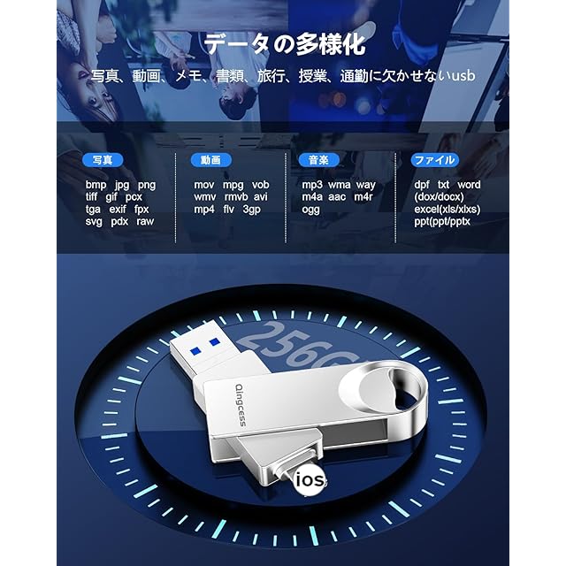 【スマホ容量不足解消-プロ級容量管理】アイフォンusbは256GBで高画質写真57,00枚・4K動画多時間分を保存可能。保存した携帯写真データはUSB内で直接再生可能(HEIC/MP4/PDF等37形式対応)。iCloudの月額2,130円(2TB)と比較し5年分のコストを削減。ビジネスファイルから家族動画まで、スマホを軽くする(Phone ストレージ)「デジタル断捨離」を実現。