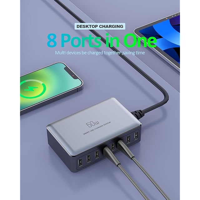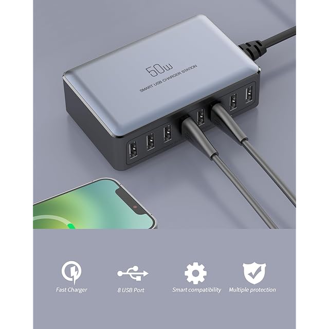 <br>8ポート usb コンセントUSB充電ステーション の基本機能:入力:AC100-240V、50/60Hz<br>USB ポート出力: 5V⎓2.4A Max<br>素材:PC+ABS<br>サイズ&重さ:30*65*105mm ,180g<br>USB 充電器使用時の注意:<br> >1. 屋内のみ。<br>2. 感電は避けてください。乾燥した防水環境での使用にのみ適しています。<br>3. リード線を引っ張ったり、プラグを強く引っ張ったりしないでください。<br>4. USB 充電器 を分解したり、ぶつけたりしないでください。<br>5. カバーやリード線が損傷した場合は、USB充電器の使用を中止してください。<br><br>▶高効率:<br>50W usb 充電器 8ポート、同時に 8 台のデバイスを充電でき、iPhone に適応できます。 iPad、Samsung、Huawei、その他のさまざまな USB インターフェイス デバイス。 生活を楽にします。<br><br>▶便利で安全:取り外し可能な電源コードにより、旅行中や家族や友人との食事中に複数のゆーえすびー コンセントを使用できます。 また、100~240Vの電圧に対応しており、海外へ出張や自宅・職場・旅行など、様々な場所への携帯にも便利です。 独自の多重保護システムにより過充電、過放電、過熱、短絡を避けて充電器自体とデバイスを保護し、安 全に充電を行います。 <br><br>▶usb充電器 ac アダプター: 1 本の電源コードだけで、自宅やオフィスできちんと整頓してください。ごちゃごちゃした配線に悩まされずスッキリ充電. また、コンパクトサイズ(10.5*6.5*3cm)で家のテーブルでもデスク上でも場所を取らずにすっきりとまとまります。 ▶幅広い互換性: i Phone、スマホ、タブレット、カメラ、MP3 プレイヤー、ポータブル充電器、電子書類、ゲーム機器、モバイルバッテリーなどに幅広く対応しています。<br><br>パッキングリスト:<br>1pcs 8ポート コンセント usb acアダプター<br>2. 取り外し可能な電源コード 1 本(US規格)<br>3. 梱包箱1個<br>