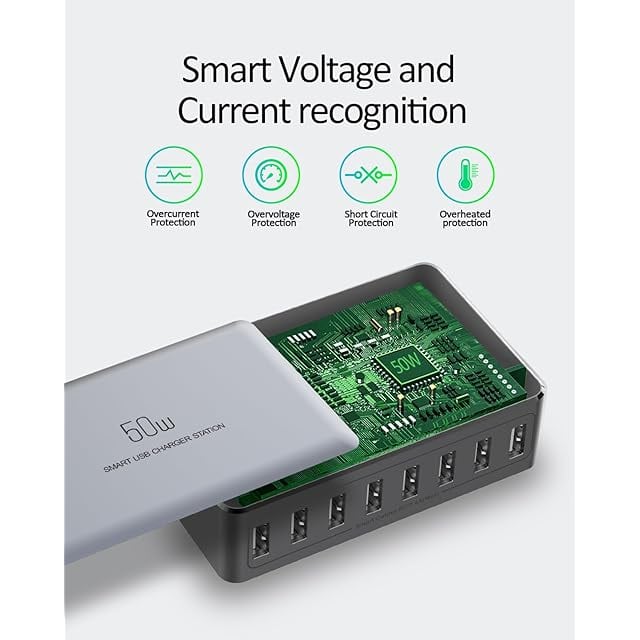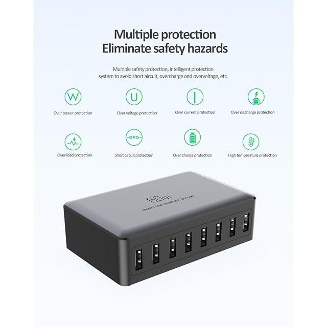 【8 ポートusb コンセント 充電器】: 50W 出力は最大 8 台のデバイスを同時に充電するのに十分です。 生活の中でのソケット不足の悩みを解決します。 多ポート同時充電時、接続されたデバイスを知的に識別でき、自動的に電圧・電流を最適値に調整します。スマホやタブレットなどに対応しており、あらゆるデバイスへ最適・最速速度での充電を実現しますと更なる安全性も実現しました。家族、オフィス、旅行での使用に最適です。