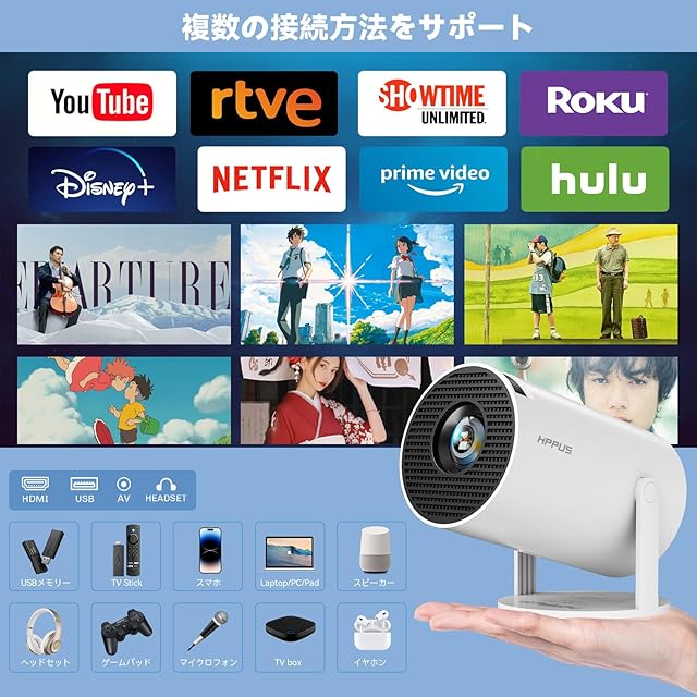 商品名:【180°回転 & Android TV】 HIPPUS Android TV プロジェクター 天井投影 小型 家庭用 自動台形補正 360ANSI 1080P 5G wi-fi 対応 Bluetooth 5.2 プロジェクター 天井 4Kビデオに適応 ホームシアター PC/PS5/Switch/FireTV Stick/DVD/USBなど対応.