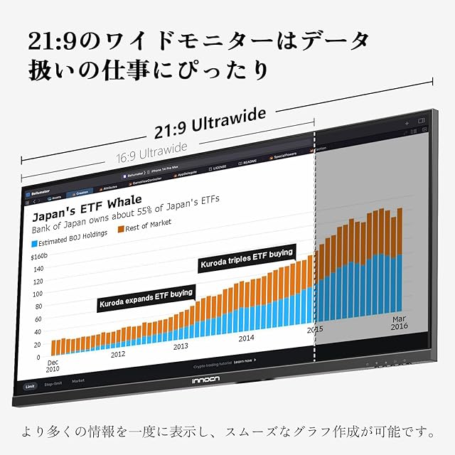 広視野角:21:9のワイドモニターは、データ分析の仕事に最適な広い画面を提供します。21:9のアスペクト比と16:9のウルトラワイドディスプレイを備えており、複数のデータを同時に表示できるため、作業効率が大幅に向上します。大画面で情報を一目で把握でき、スムーズなグラフ作成が可能です。