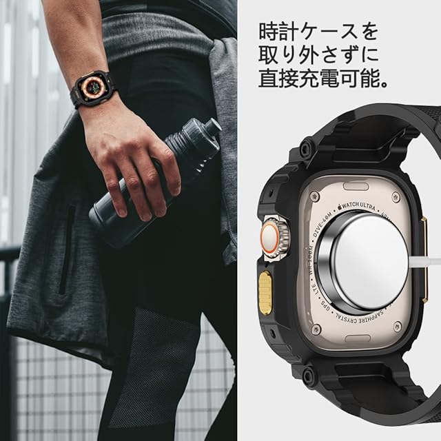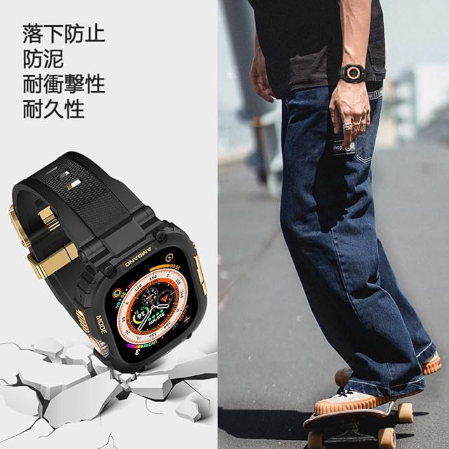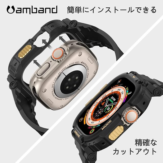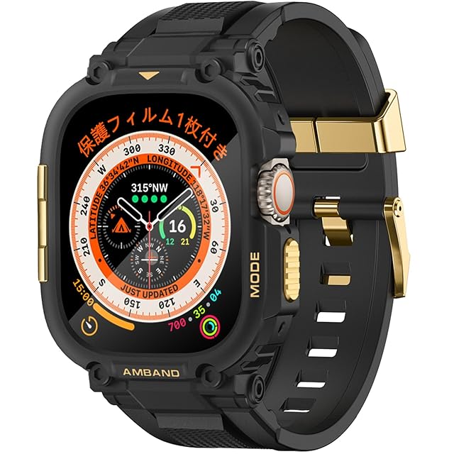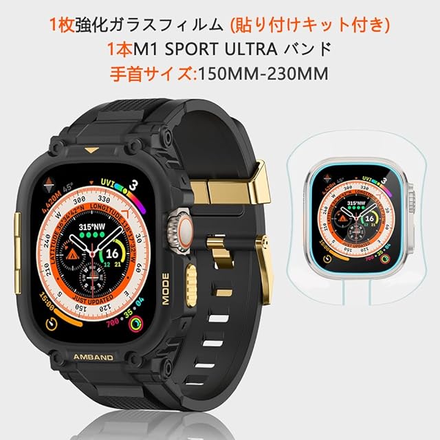 商品名:amBand バンド ケース コンパチブル For Apple Watch Ultra2/Ultra 49mm 強化ガラスフィルム付き* 1 バンパーカバー付き 頑丈なTPUベルド 一体型 M1 スポーツバンド アップルウォッチ ウルトラ 2に対応 49 mm メンズ 耐久性 耐衝撃 装着簡単 ブラックゴールド