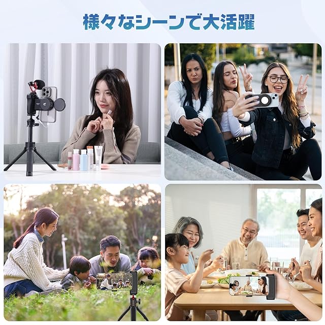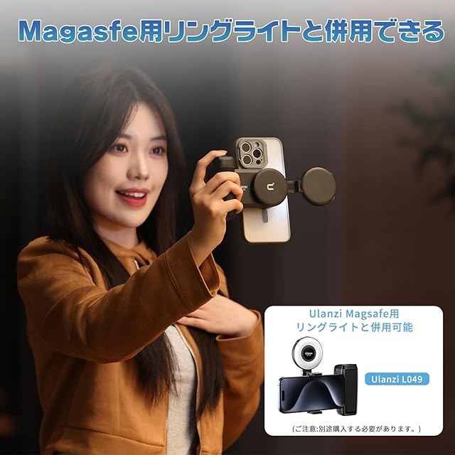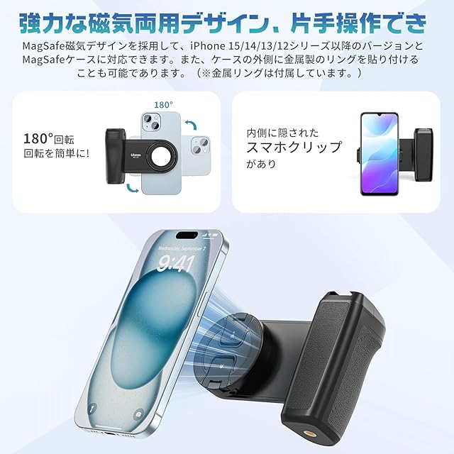 商品名:Ulanzi スマートフォンホルダー Magasfe&クリップ両用 スマホグリップ Bluetoothリモコン付き 超强磁力 片手操作 人間工学設計 180度回転 化粧鏡付き 旅行 写真 動画を撮る スマートフォン三脚マウント 1/4ネジ コールドシュー付き 一脚 三脚 自撮り棒 iPhone Androidに対応 日本語取扱書付き MA35
