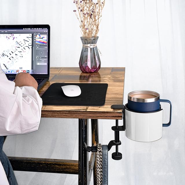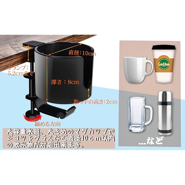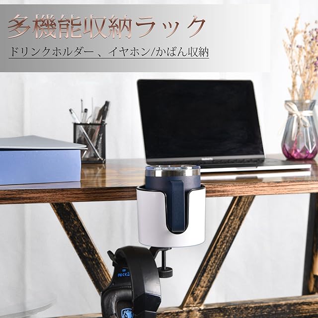 【スペース節約】デスクや机にクランプでしっかり固定して、空間を有効に利用し、ドリンクやイヤホンやカバンなどを収納出来ます。また、コーヒーや飲み物をドリンクホルダーに置くと、うっかり触れて机にこぼすことがなくなります。