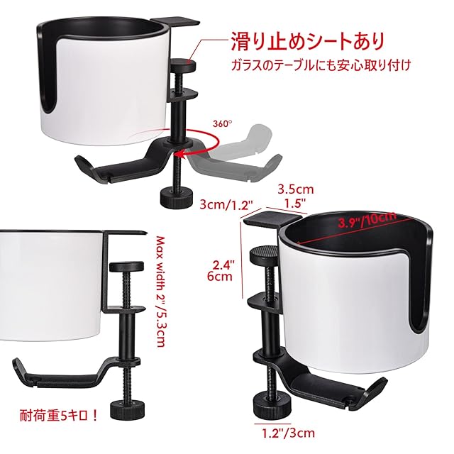 商品名:Shenytic ドリンクホルダー デスク イヤホンスタンド テーブル ドリンクホルダー 大きめカップホルダー 対応直径10cm以内 多機能収納ラック ABS+アルミ合金製 360度回転 耐荷重5キロ ホワイト