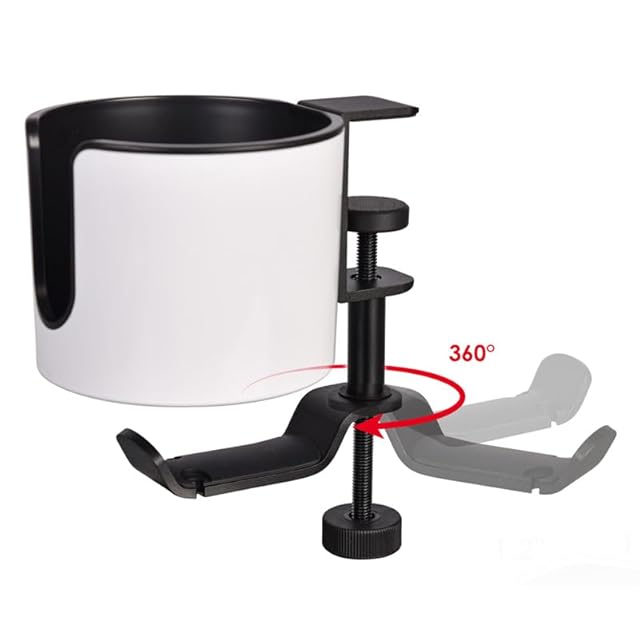 【2イン1&360度回転可能】上部はドリンクホルダー収納、下部はイヤホン収納を組み合わせたオプションは、作業中やゲーム中に最適です。使い終わったイヤホンを一時的に置いたりするのに便利です。下部は360度回転式です。イヤホンだけではなく、カバンや傘なども掛けます。耐荷重5キロです。