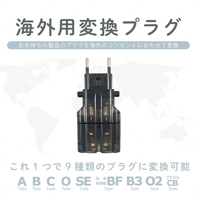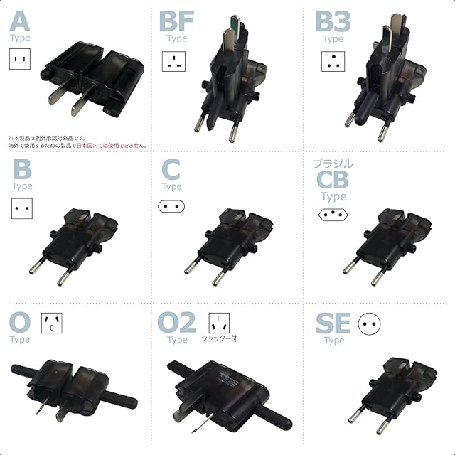 日本製品(Aタイプ)だけでなく海外製品(B,C,O,SE,BF,B3,O2,CB:ブラジルタイプ)の電源プラグも変換することができます。