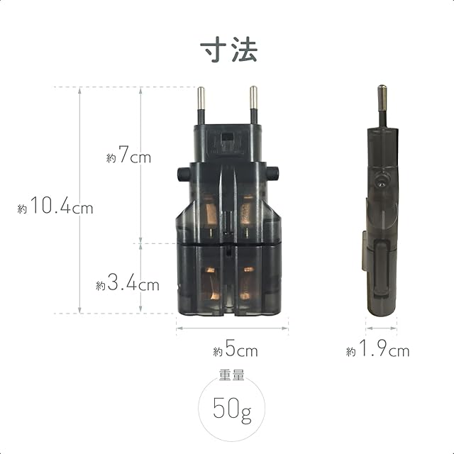 本体サイズ:50Wx104Hx19Dmm / 本体重量:50g / 素材・材質:PC樹脂 / 生産国:日本 ケース:中国製/ 定格:6A/250V