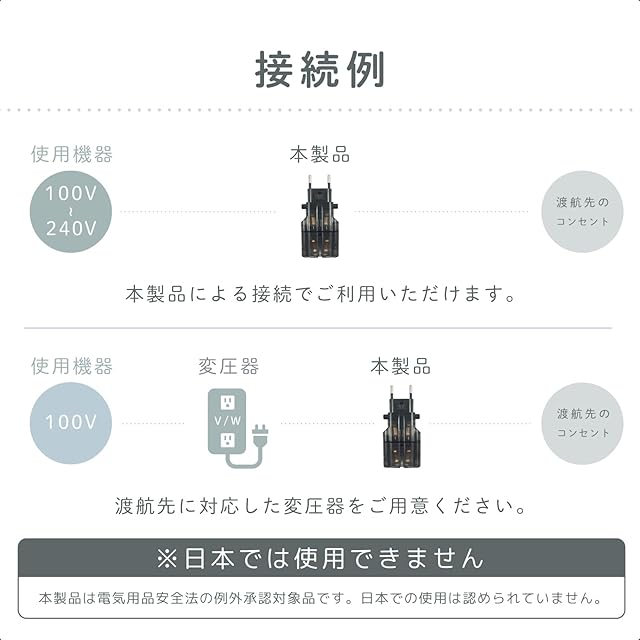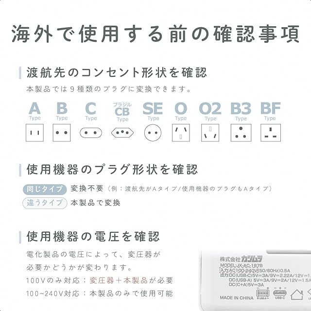 *変換プラグは電圧を変換するアダプタではありません。海外の電圧に対応していない電気製品の場合は別売の海外用変圧器と併用してお使いください。