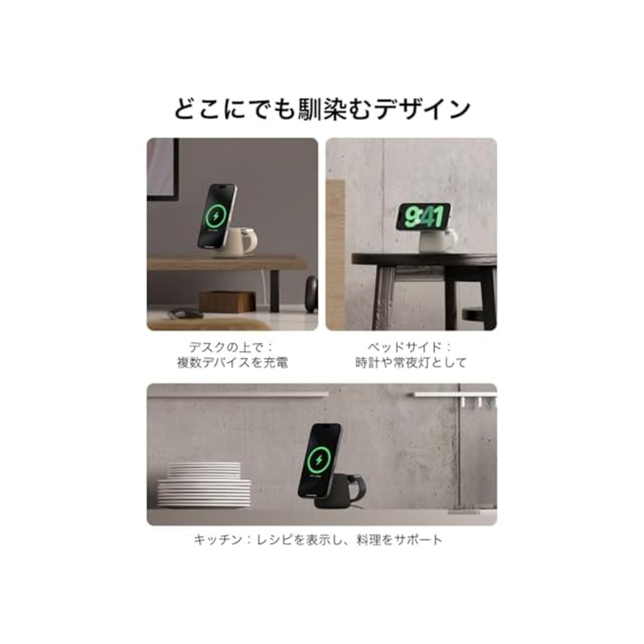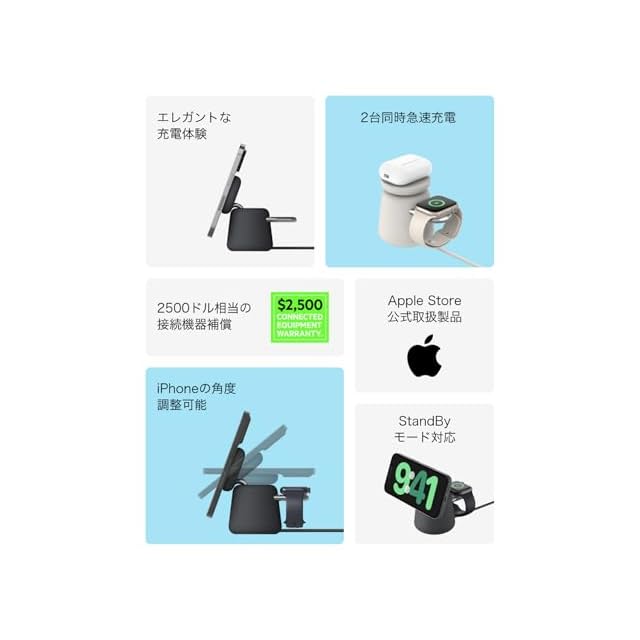 【iPhoneのスタンバイモードに最適】BelkinのMagsafe対応ワイヤレス充電器WIZ020は、iPhoneのスタンバイモードに合わせて設計されました。充電台は0~70度の範囲で角度を調整でき、ベッドサイドやデスクどんな場所で充電していても画面を確認できます。充電台滑り止め付きでマグネットでしっかりとiPhoneを吸着、お好みでiPhoneを横向きにして配置することも。
