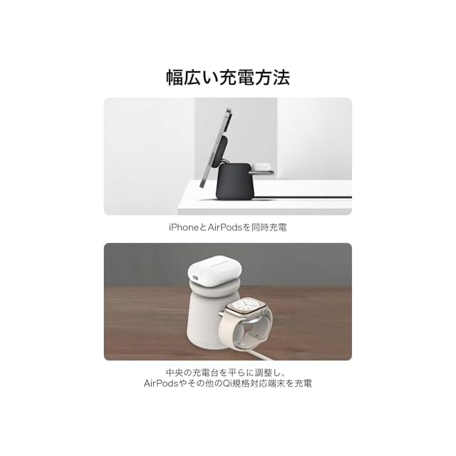 【Apple製品の充電はこれ一つで】iPhone、Apple Watchに加えAirpodsの充電もこれ一つで。AirPodsは製品正面の充電台か、MagSafe対応モデルのAirPodsであれば、背面のApple Watch用の充電台でも充電できます。同時充電は2台まで。