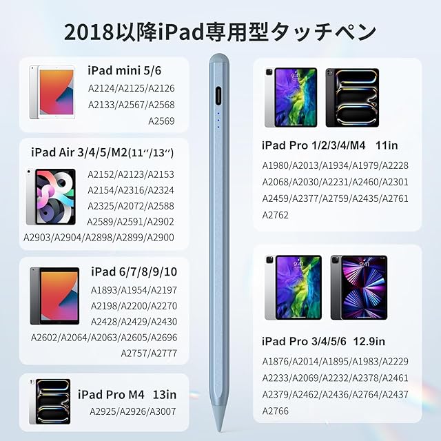 【2018年以降のiPad専用タッチペン】対応機種:iPad (第6/7/8/9/10世代)、iPad Pro 12.9” (第3/4/5/6世代) 、iPad Pro 11”(第1/2/3/4世代) 、iPad Air (第3/4/5世代) 、iPad mini (第5/6世代)。(iPadモデルをiOS13.1以降に更新する必要があります。)