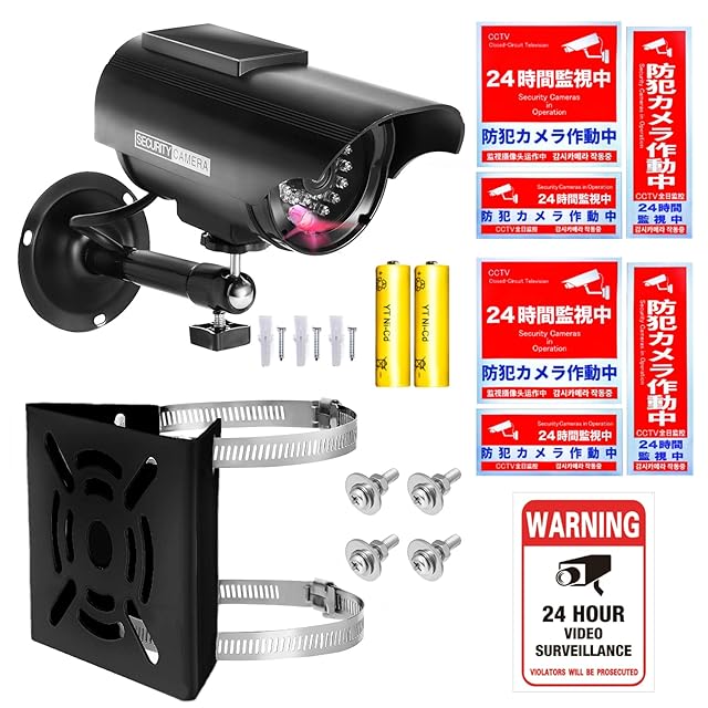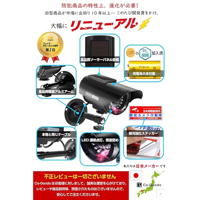 < ダミー防犯カメラ > 【本物の 防犯カメラ (ボックス型) に、赤色LEDが「点滅する」、アームが「プラスチック製」の商品はほぼありません! ご注意ください】✅ 【耐久性・リアル感強化!】ダミーとバレやすい点滅LED、プラ製のブラケット(下から見上げるとプラ製とすぐ分かります)を、コストをかけ実際にリアル防犯カメラで多く使用されている「薄めLEDで常時点灯」「高品質軽量スチール製」に変更しました。 ✅【 ソーラー ×付属充電池2本=24時間連続使用可能】ソーラーパネルには、発電効率・耐久性の優れた単結晶シリコンパネルを採用。 日中LED発光+付属充電池への蓄電を行うことで、夜間含む24時間連続使用が可能となりました。[別売り]によるお客様のご負担は有りません。 ✅ 【防水機能×電池交換簡単】製品仕様に工夫を凝らし、軒下防滴機能がありながら「電池交換が道具を使わずに簡単にできる仕様」を実現いたしました。✅ 【最新LED搭載】発光部分は、長寿命赤色 LED を使用しております。 ✅ 【リアルケーブル】ケーブルは、実際に「リアルカメラで使用されているケーブル」を採用しました。