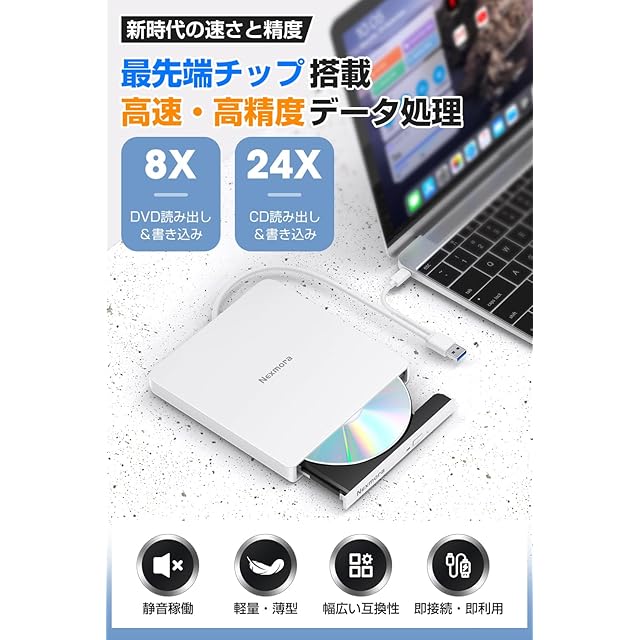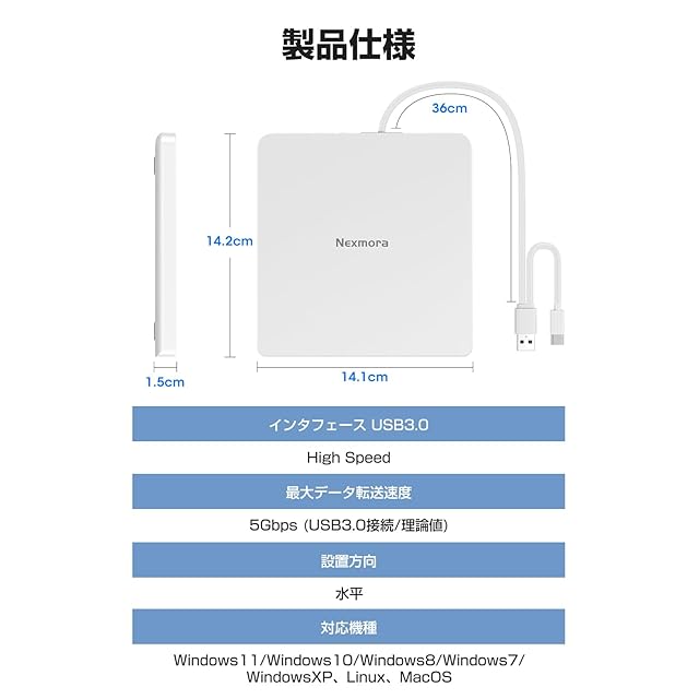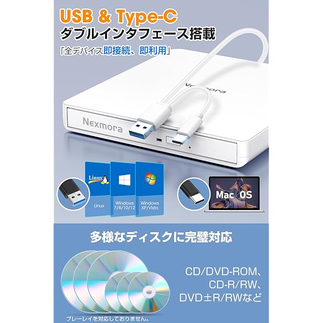 商品名:【2024革新型・高速USB3.0対応】 CD DVDドライブ 外付け 静音 DVDプレーヤー 外付けDVDドライブ USB3.0&Type-C両接続 読取/書込可 CDプレーヤー バスパワー駆動 外付けCDドライブ 軽量 薄型 光学ドライブ 外付け CDドライブ Mac PC パソコン Windows11対応 Windows10/8/7XP 外付け CD DVD ドライブ (オフホワイト)