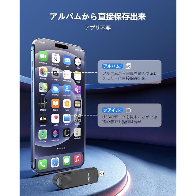 【完全アプリ不要】Phone/スマホから直接usbに写真を移す:Phoneのアルバムを開く→保存したい写真を選択→「USBへ転送」をタップするだけ!3ステップで直保存可能な完全アプリフリー設計。ios端子を挿すだけで自動認識され、フォルダ分けも自動化(年/月別分類)。機械操作が苦手なシニア層でも迷わず使えるカラー図解マニュアル付き。