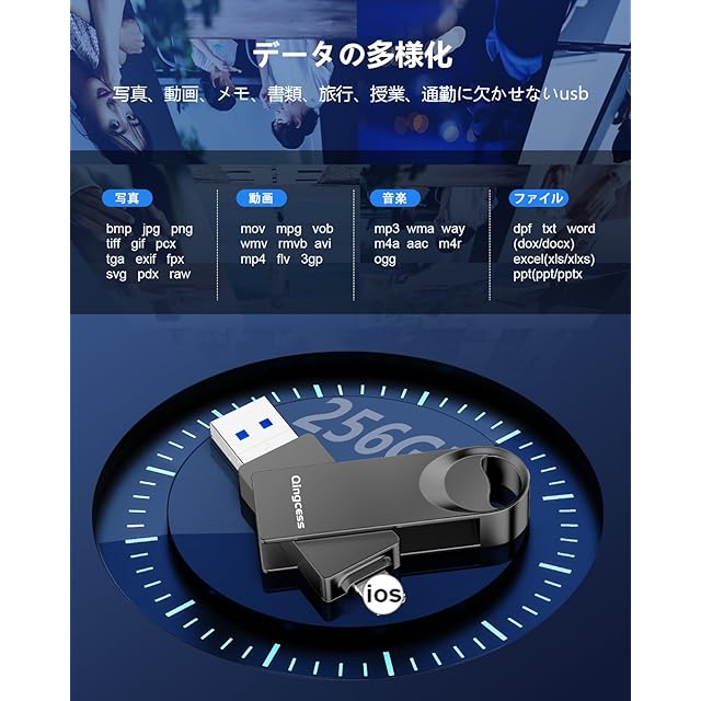【スマホ容量不足解消-プロ級容量管理】アイフォンusbは256GBで高画質写真57,00枚・4K動画多時間分を保存可能。保存した携帯写真データはUSB内で直接再生可能(HEIC/MP4/PDF等37形式対応)。iCloudの月額2,130円(2TB)と比較し5年分のコストを削減。ビジネスファイルから家族動画まで、スマホを軽くする(Phone ストレージ)「デジタル断捨離」を実現。