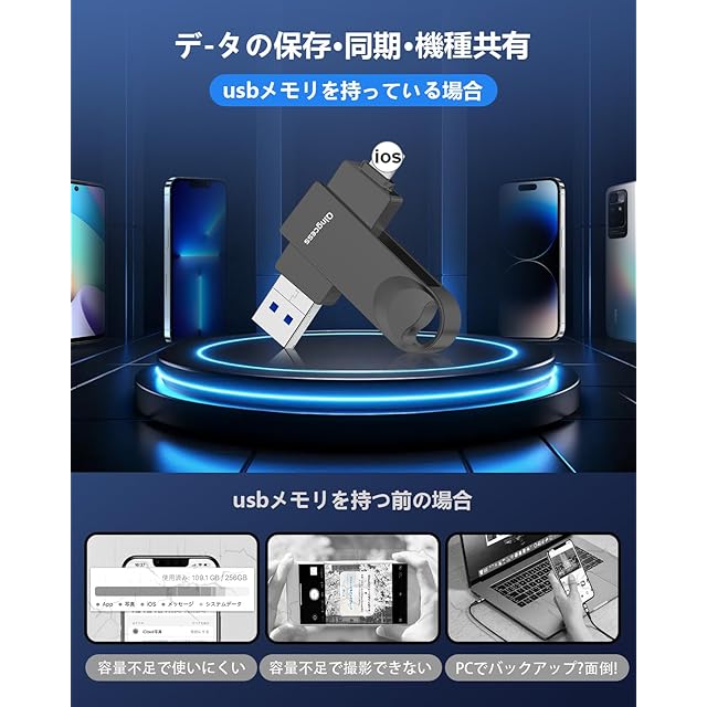 【USB3.0高速化--WIFI 不要】Phoneの写真移動が簡単で超高速usb3.0、icloudを使っていたころは、写真バックアップするにはwifiが必要でしたが、このフラッシュメモリはいつでもどこでもネットを使わずにデータを見る、月額のアイクラウド料金を節約することができます。Phoneを差し込むだけでusbの写真をlineやインスタなどの友達に共有でき、PCだけでなく他の媒体への移行が簡単にusb 高速 バックアップできるのでおすすめです。