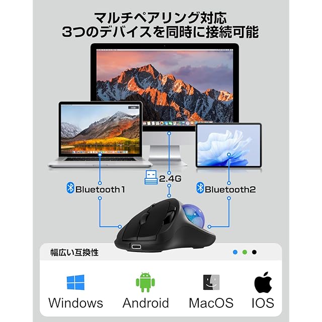 商品名:EWiN マウス トラックボール 無線 Bluetooth&2.4GHz両対応 3台同時接続 5段階DPI調節 Type-C充電式 500mAh大容量バッテリー ワイヤレス マウス 高精度 親指操作 7ボタン 進む/戻るボタン Windows/Mac/iOS/Androidなど対応